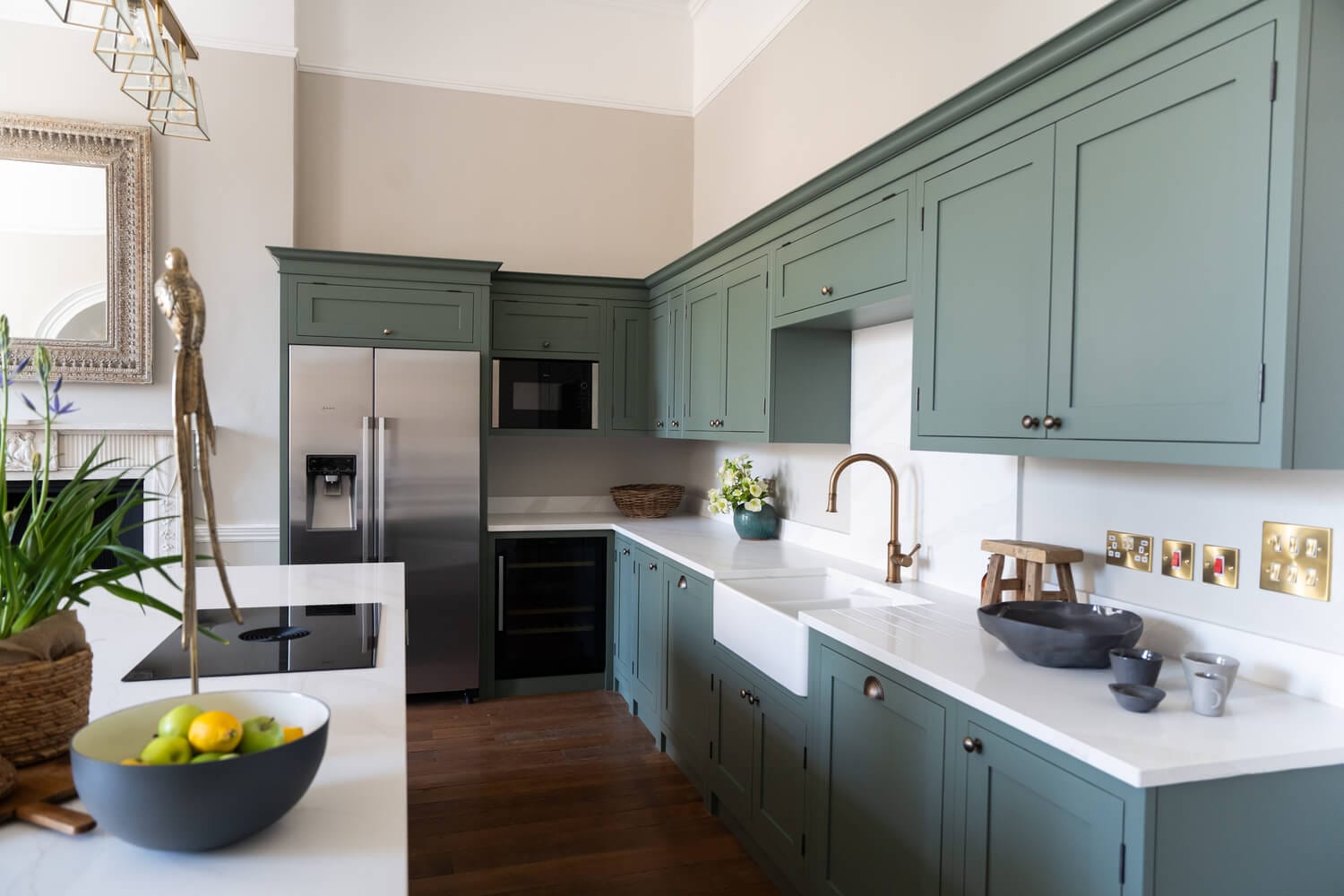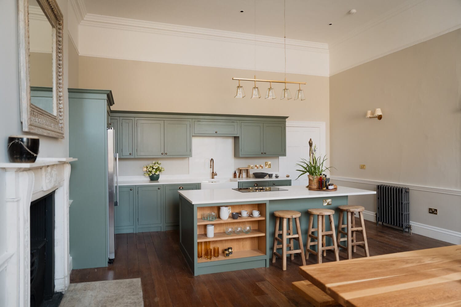 As you enter the stone flagged hall on the ground floor you are immediately aware of a feeling of space and light, and are presented with a green view right the way through to the garden at the rear. Double half-glazed doors with fanlight lead into the kitchen at the front with soaringly high ceilings, a marble fireplace and bespoke, handmade cabinetry and worktops that have been meticulously designed to provide a sociable yet functional kitchen for all to enjoy. Included is a fitted American-style fridge freezer, wine fridge, integrated dishwasher, oven, integrated microwave, warming drawer and large induction hob. The large island in the centre includes a useful and informal breakfast bar and there is plenty of space in the room for a more formal dining area.