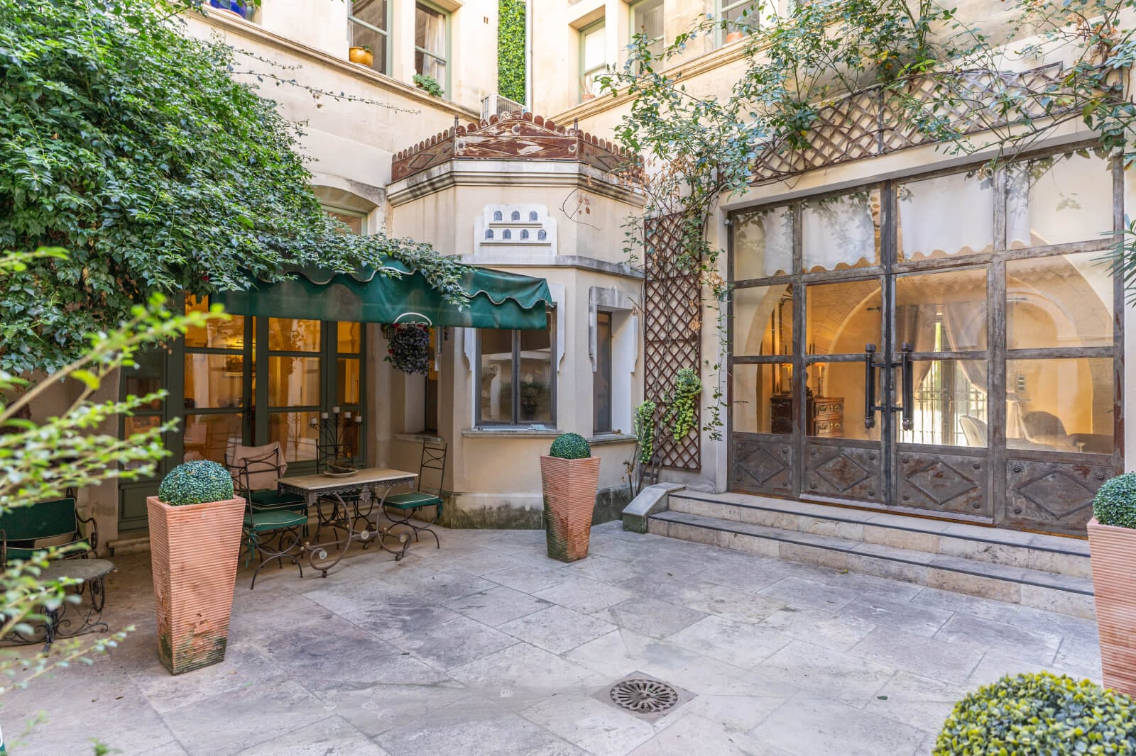 The three outdoor areas are all enclosed spaces, but they have different traits. The main courtyard is majestic and rich in ornamentation. It offers an area of around 90m², dotted with old Anduze vases in which elegant palm trees grow. Every aspect of architectural articulation here is a work of fine art, for example the mascarons that adorn the pilasters and represent the four seasons.
