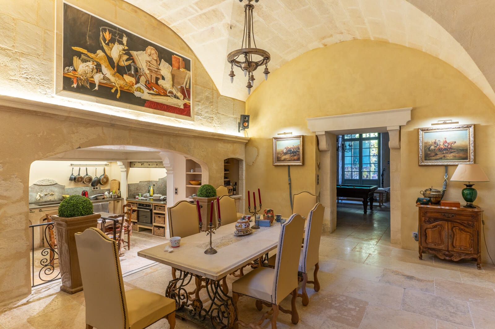 The apartment faces south-southeast. It takes up the entire ground floor of the town mansion. Two courtyards and a garden divide the dwelling into different spaces for everyday life at the same level. All the rooms lead outside. Groined vaults extend above a vast lounge, a billiard room with a fireplace, an open-plan kitchen, a dining room and a library. Generously sized corridors connect to three bedrooms. There is a master bedroom, which takes up a former courtyard, the old eaves of which the bedroom has preserved. There is a second bedroom in a small two-floor apartment with well-designed passages that almost make it a self-contained unit. And lastly, there is a spare bedroom. A television room completes the apartment on its north-west side. Large limestone tiles adorn the floors. The surprising spaciousness of the passages that lead around the place reinforce this dwelling’s palatial splendour.