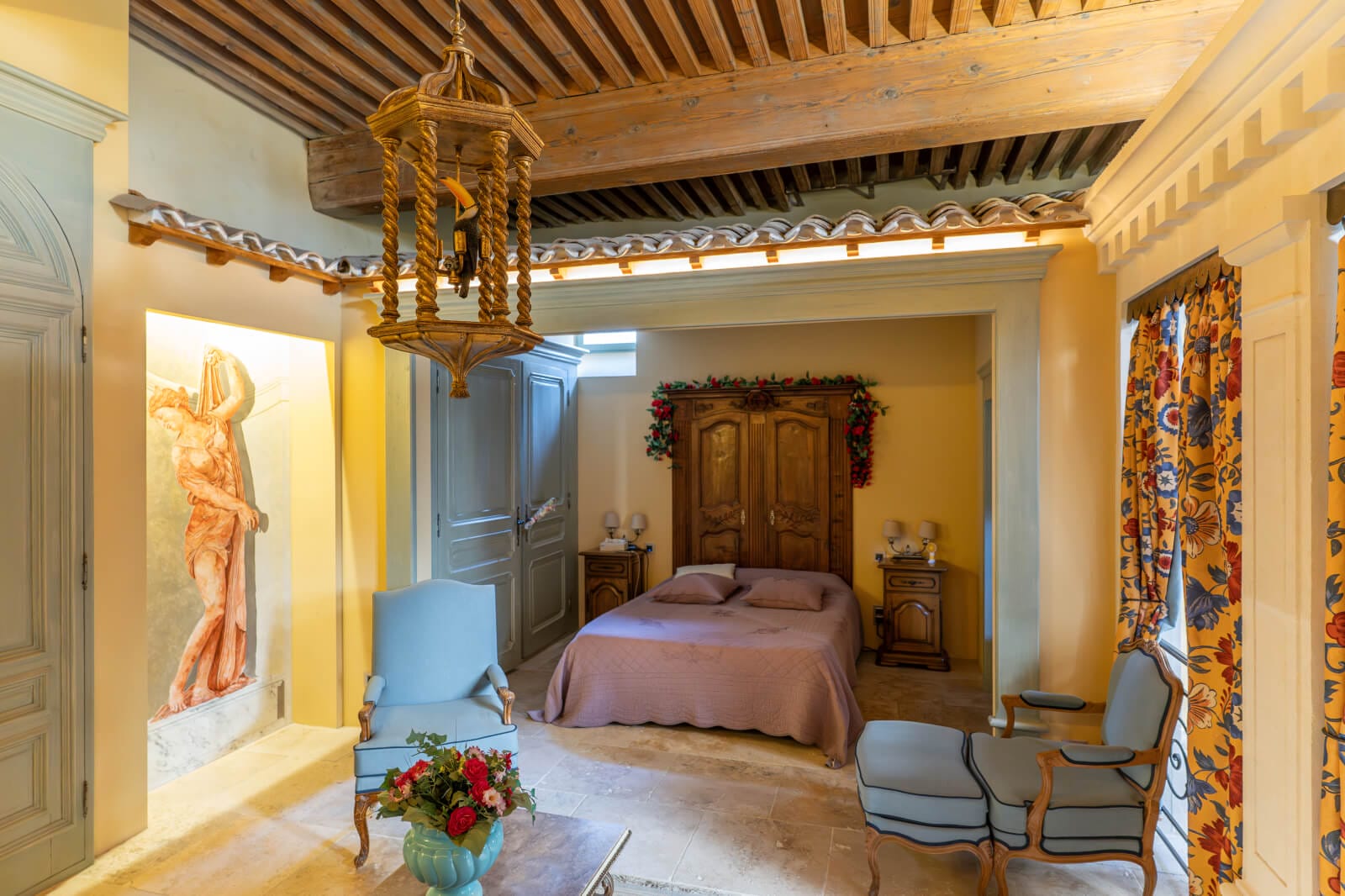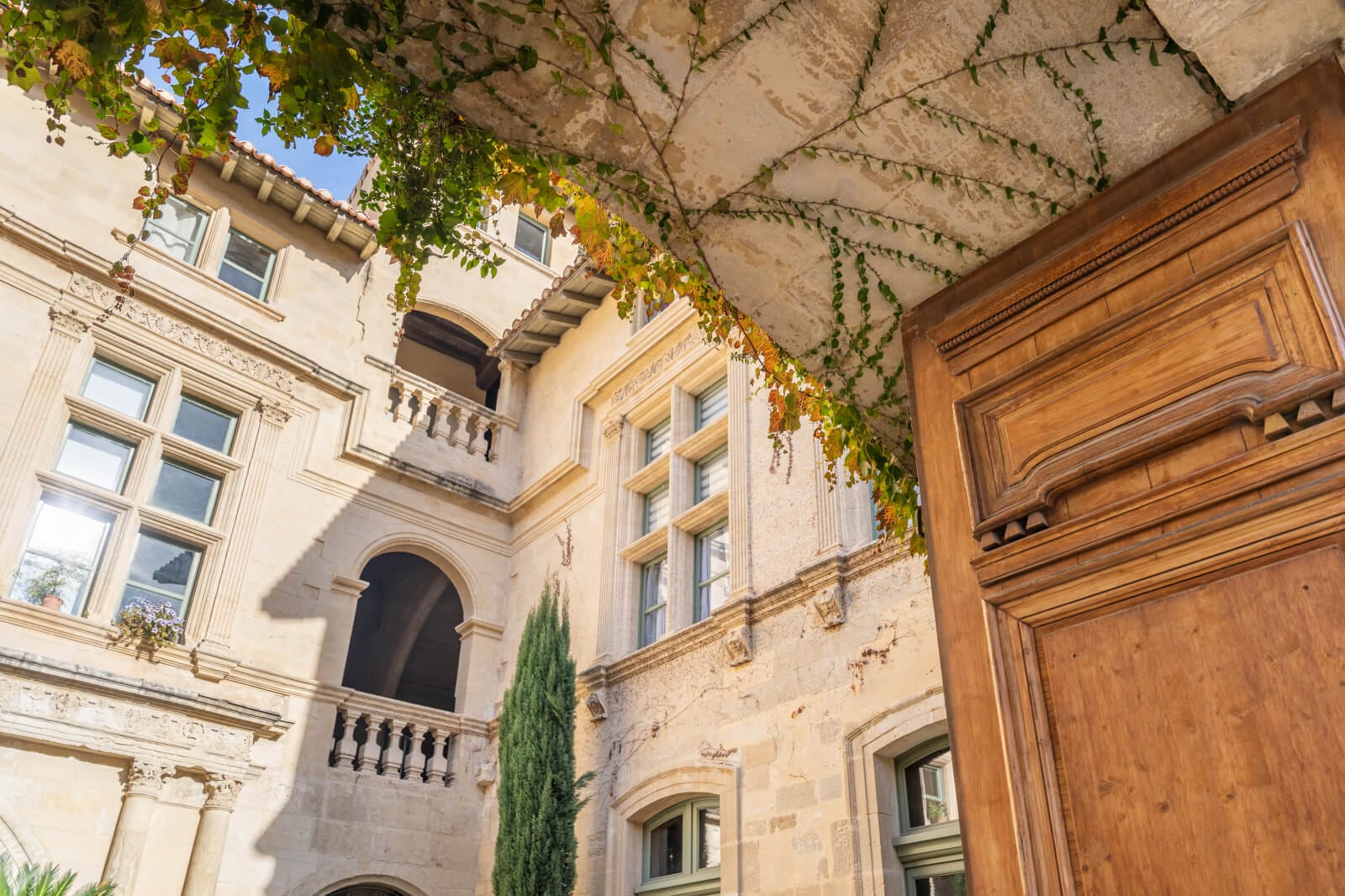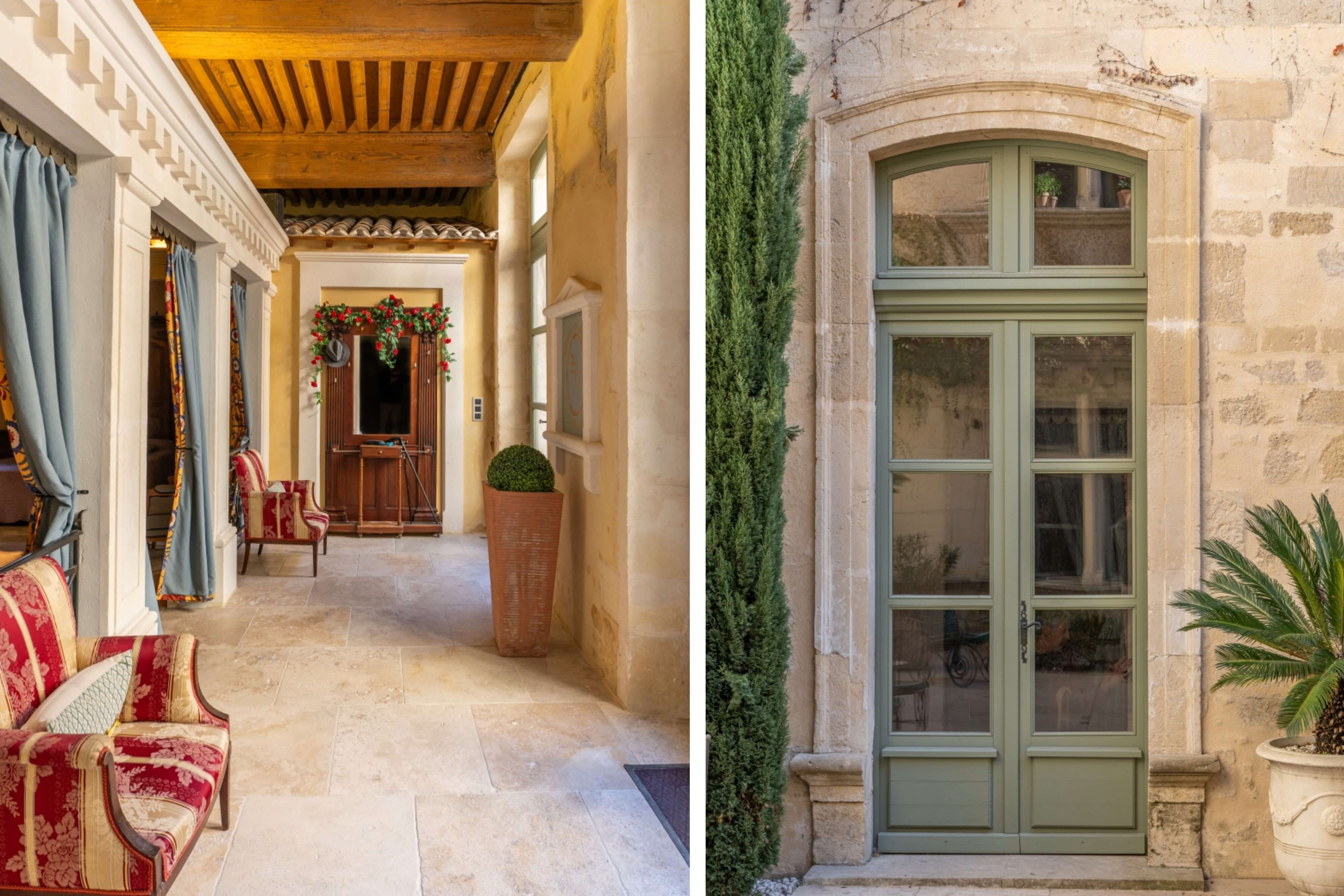 The house was the jewel in the crown of the medieval town’s aristocratic district, which showcased sumptuous princely homes up to the Second World War when the Allied bombings, carried out to liberate France, razed these gems to the ground. Among the ruins, this mansion was the only survivor from the district’s past splendour. In the 1950s, the charming home had to start sharing the company of soulless concrete blocks of accommodation born of the frenzied drive to rebuild liberated France and urgently rehouse its people based on a post-war Corbusian model of architecture. So the edifice is now at a junction between two worlds, where the Middle Ages and contemporary design collide, between two pivotal chapters in France’s long story. The building illustrates this poignantly: it seems to be turning its back on the royal chateau to face the modern housing nearby. It is guarded by tall walls that it inherited from its initial propose as a fortified house. These walls separated it from the nearby royal chateau and protected it from any devastating flooding from the River Rhône. Its old facade looks south at a range of 1950s brutalist buildings. To tone down this sharp contrast between historical architecture and modern structures, the local authorities added vegetation to the large paved square in front of the mansion, planting a cypress and olive trees here. Before then, this square was in a state of decline. Now it is a no-parking area. From this pleasant square, the property’s large entrance gate leads into the main courtyard of this Italian-style palace.
