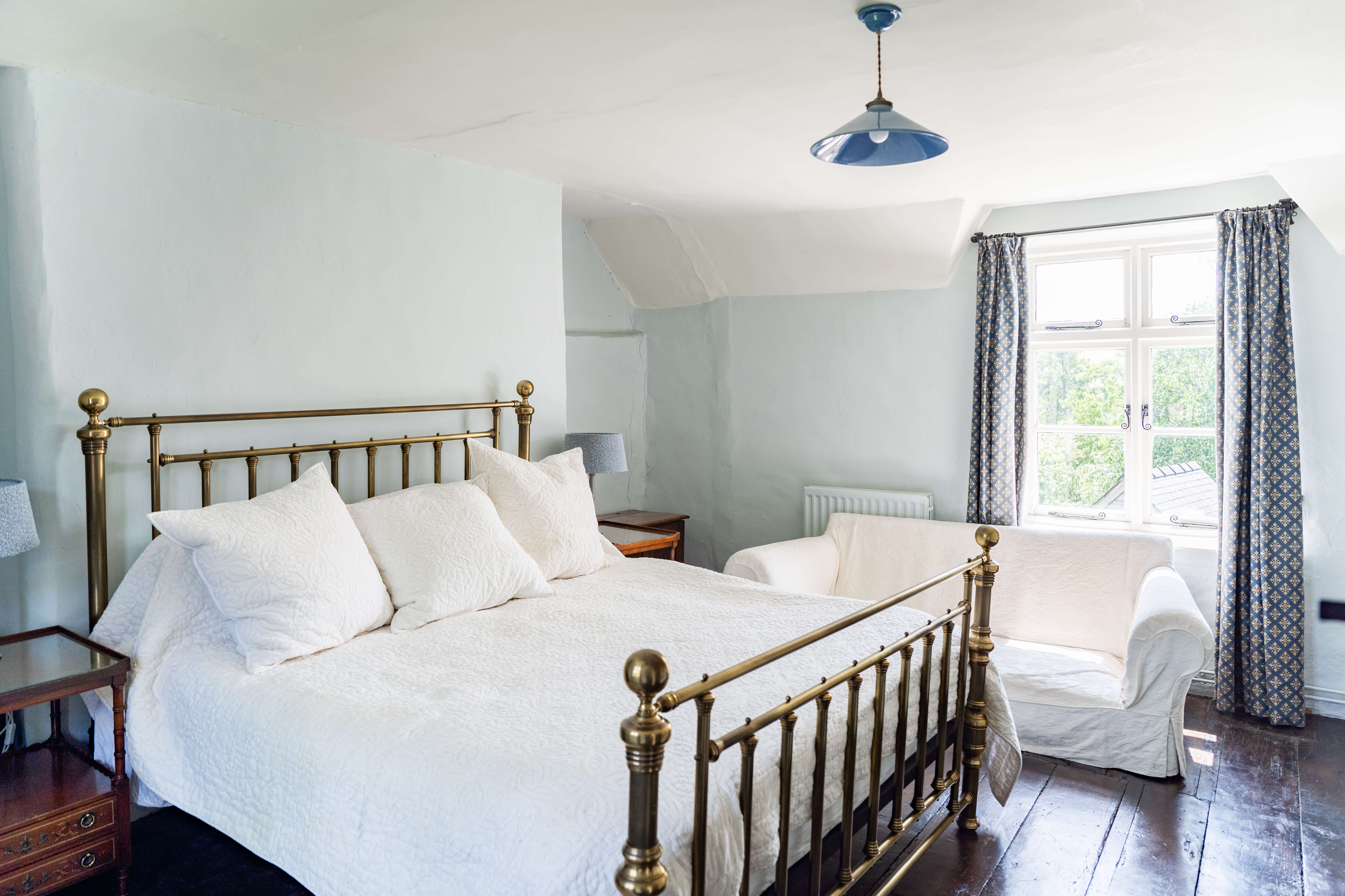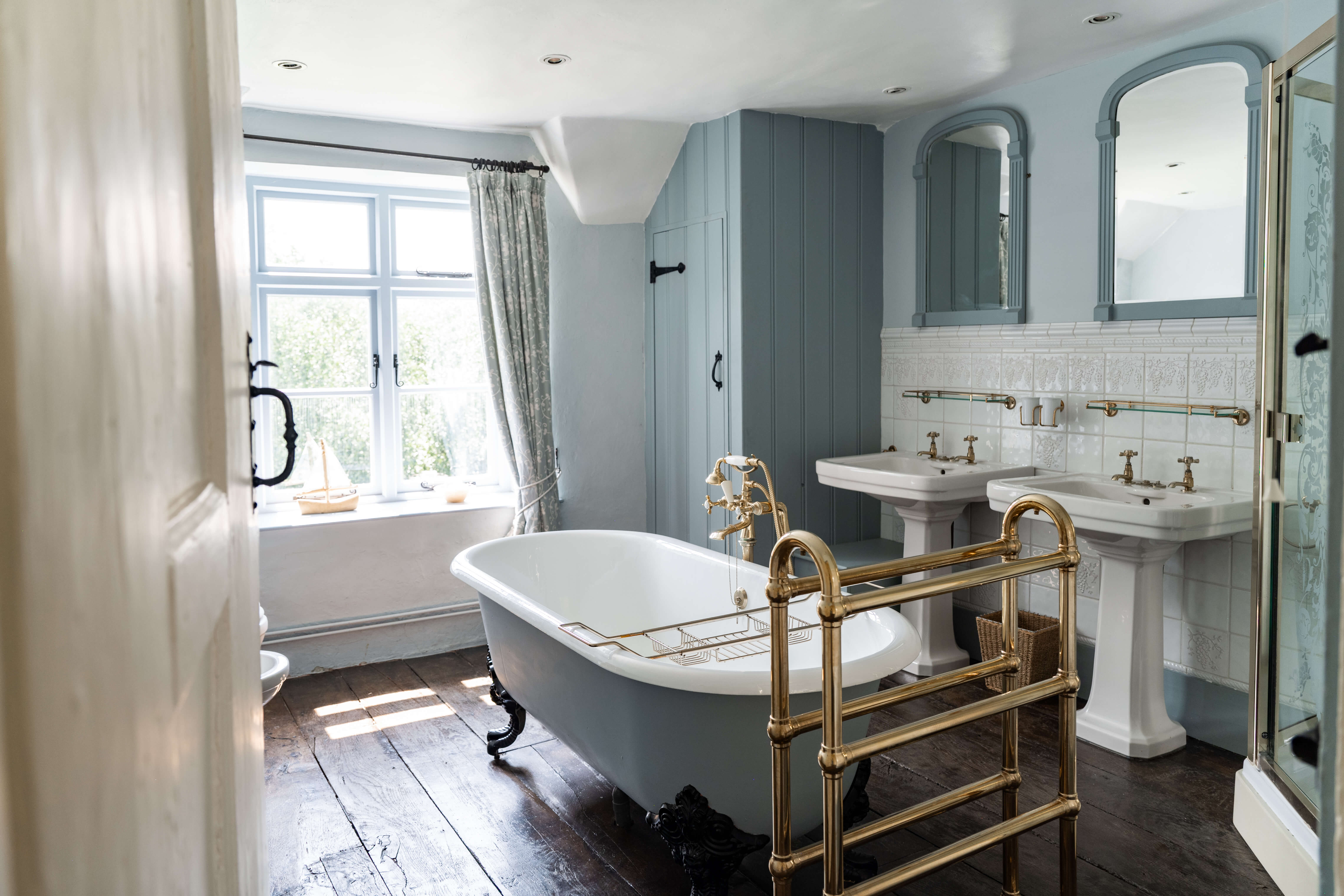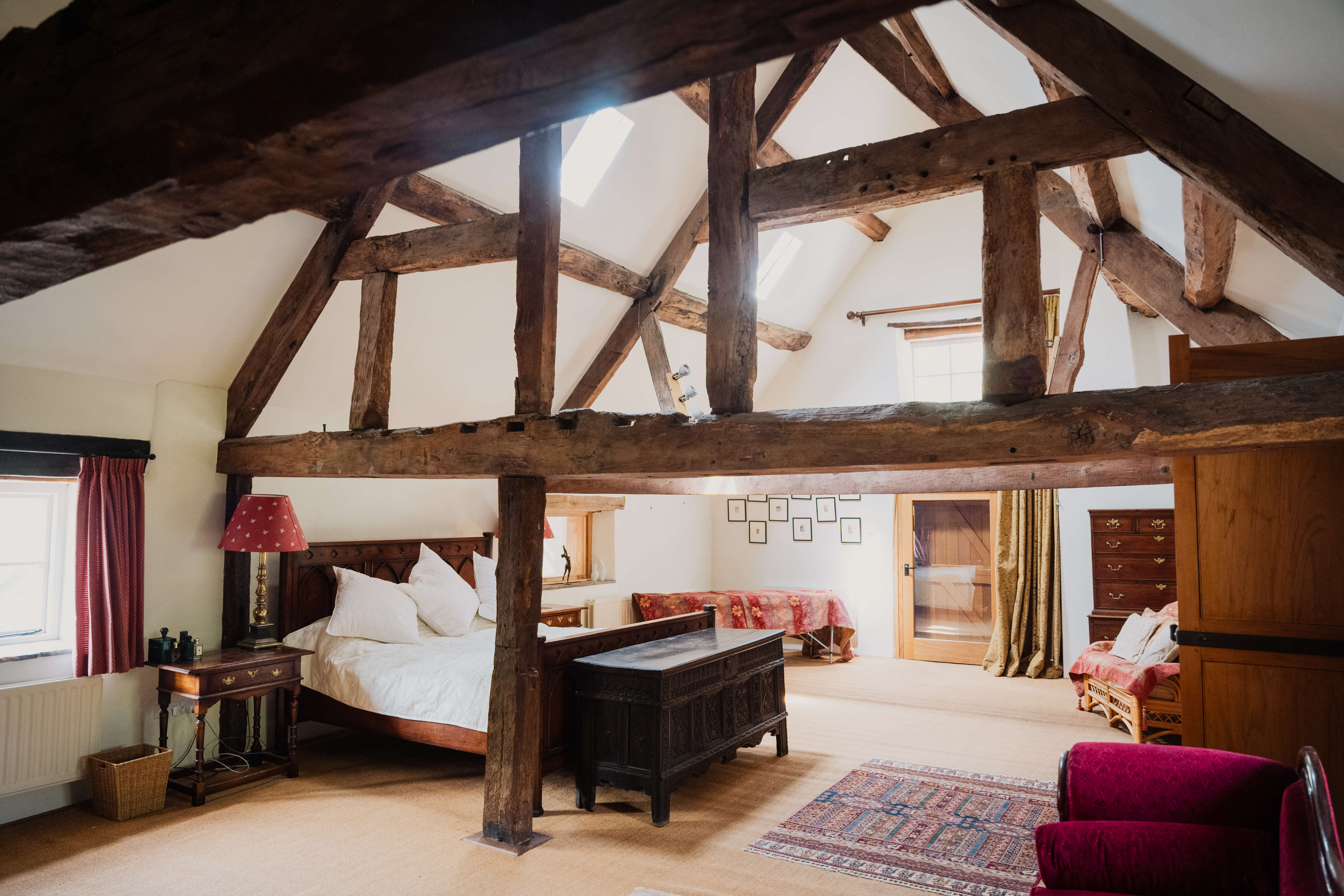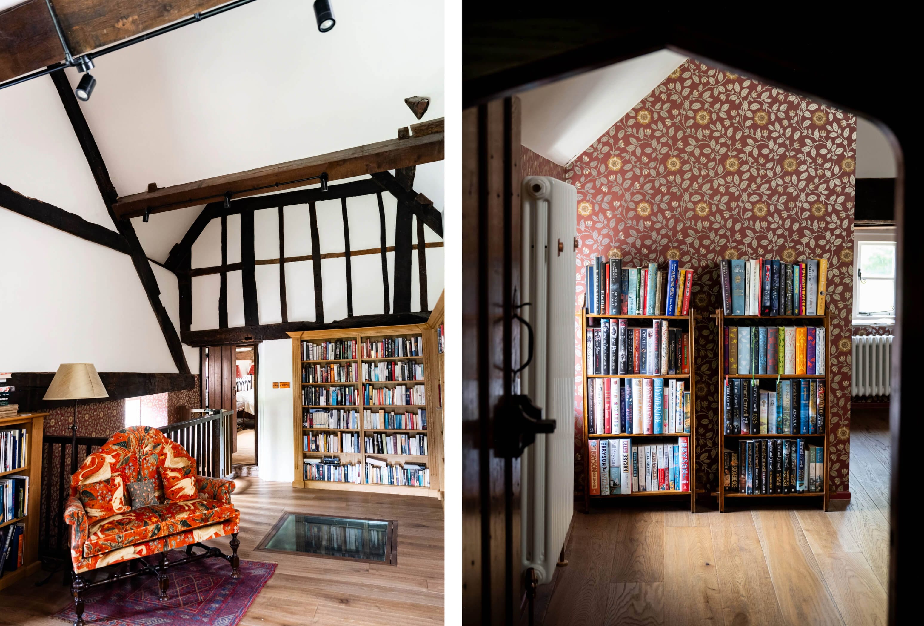 Upstairs are six good-sized bedrooms. The bright and airy dual aspect principal bedroom suite is situated in the old granary and cider barn. The principal bedroom enjoying a fantastic high vaulted ceiling with ancient beams and a smart modern ensuite bathroom. The house has five further bedrooms and two further bathrooms, all great sizes and beautifully appointed. The library, which was formerly part of the granary barn, features soaring ceilings, extensive bespoke oak bookcases, and pretty wallpaper.