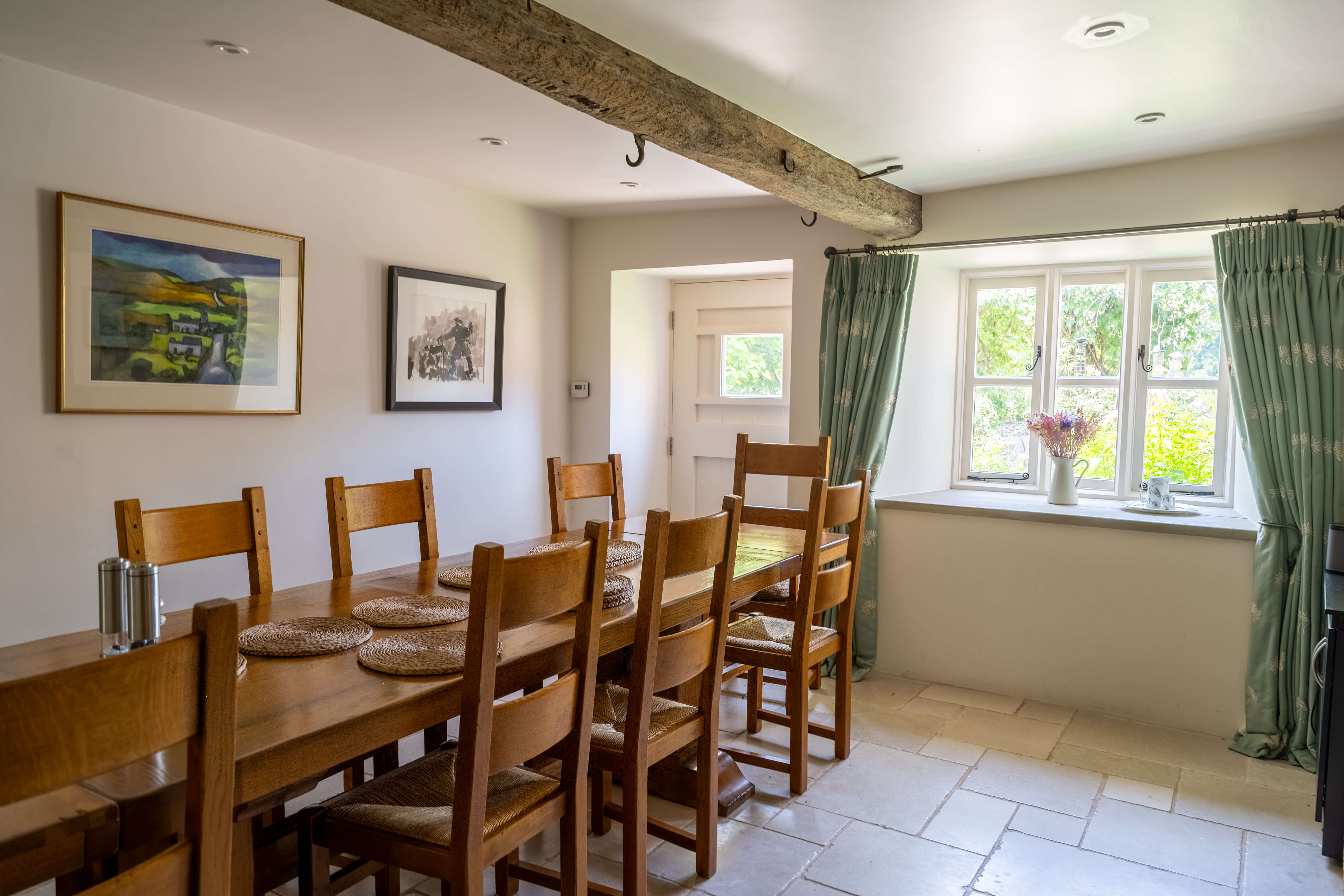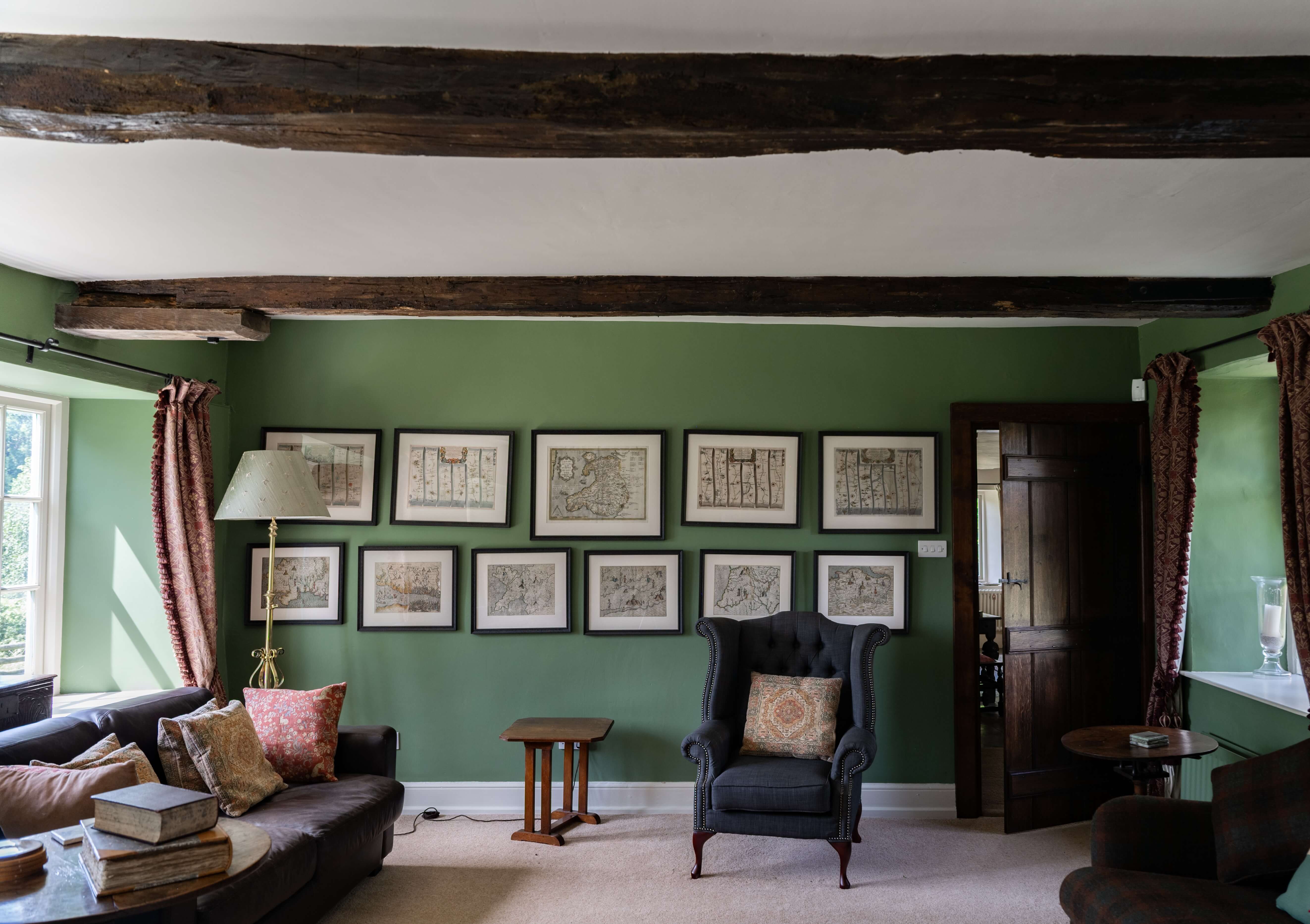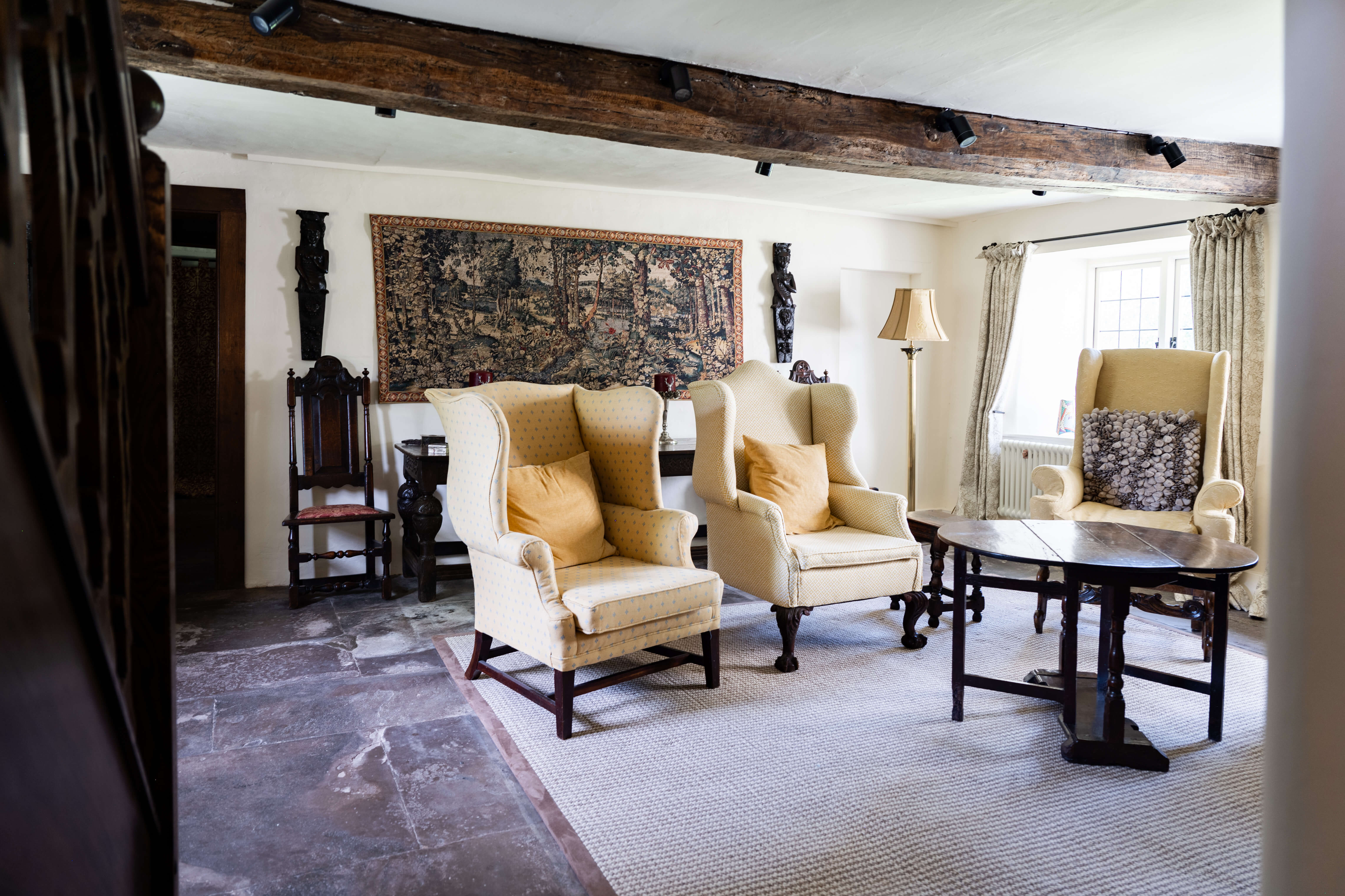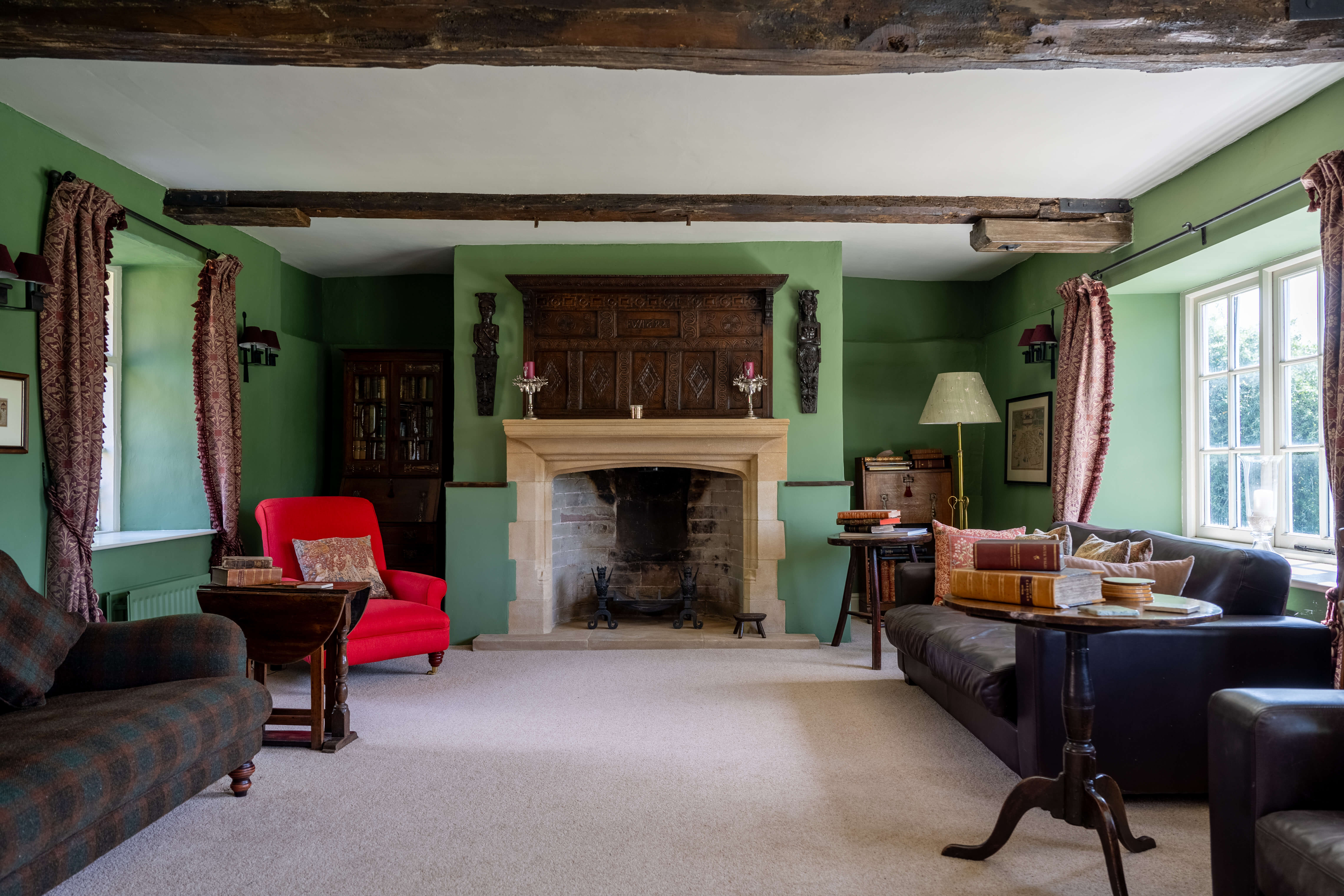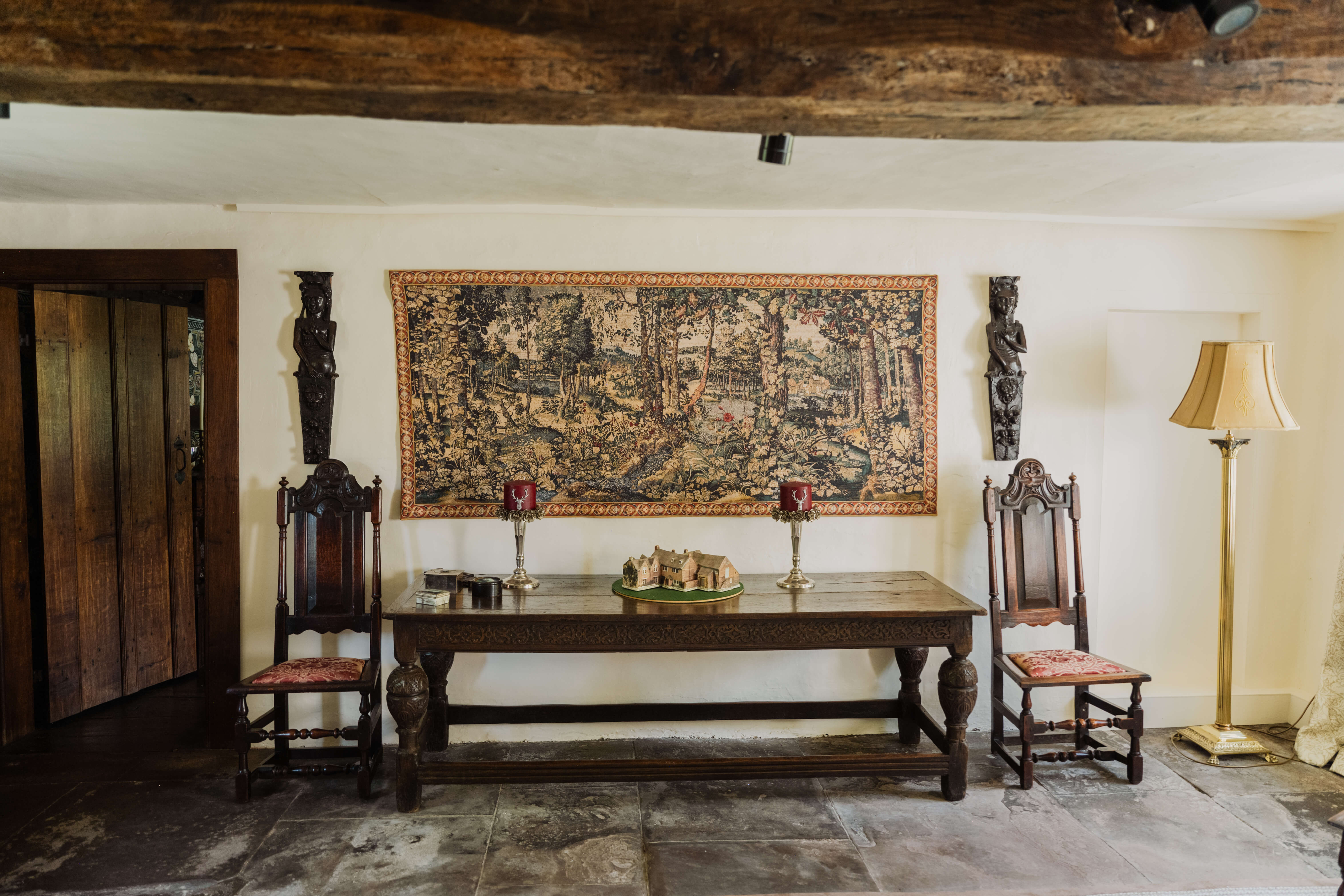 A fittingly smart and period oak front door is accessed via a lovely entrance porch with pretty internal murals and benches. Inside there are many characterful features that one would expect of a house of such historic merit, including exposed beams, fantastic timber doors, period fireplaces, flagstones, and timber floors. The porch opens into a large flagstone hall with a log burner, which doubles up as an extra reception space. The dual aspect green-painted drawing room with stone chimneypiece and pretty garden views is ideal for entertaining, as is the atmospheric formal dining room with log burner and beautiful Tudor-style wall paintings. The reception hall offers an addition sitting room. There is a separate family room, with its beamed ceiling, large leaded window and impressive inglenook fireplace with log burner and original bread ovens, which leads from the kitchen/dining area.